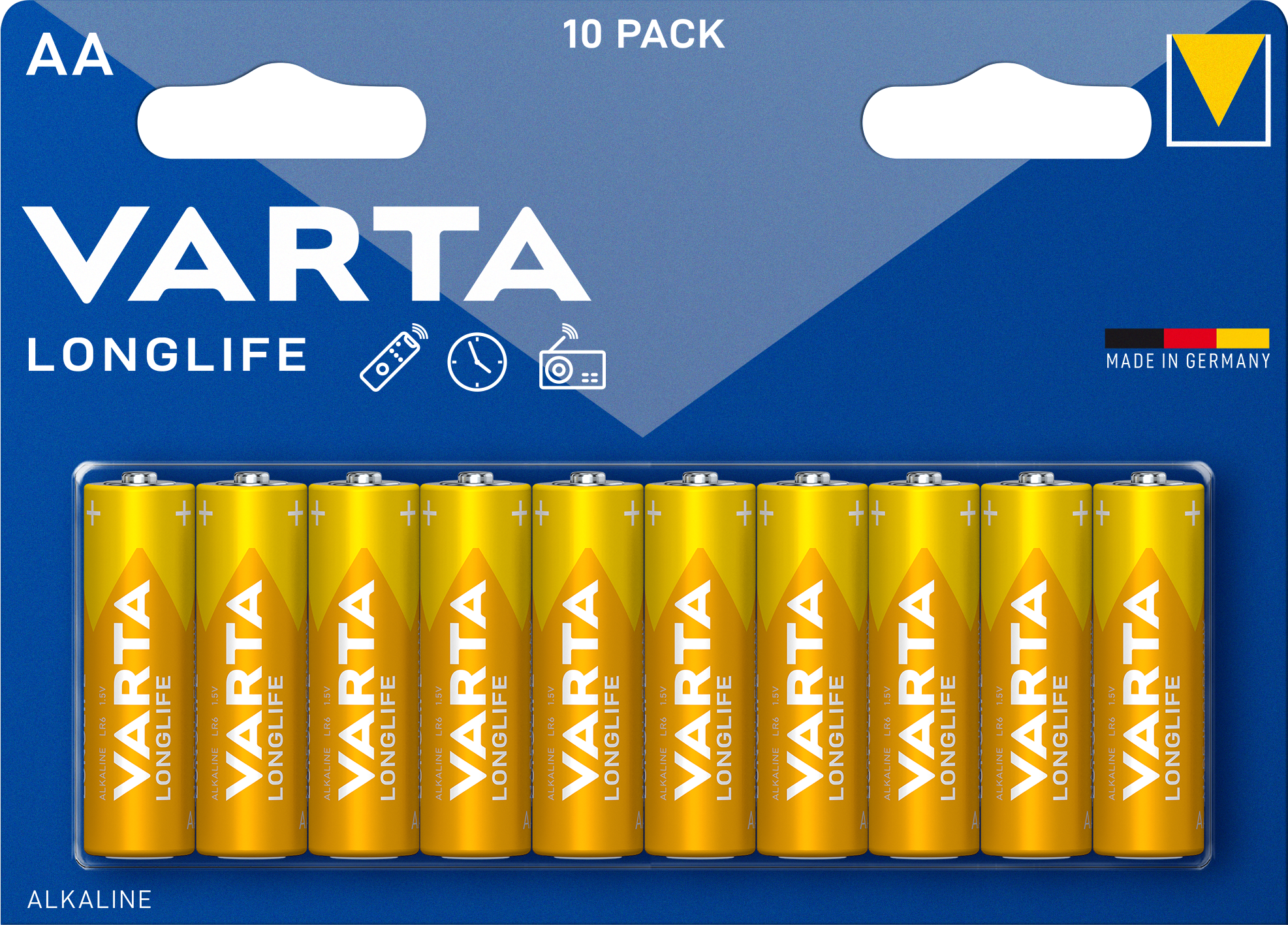 VARTA Alkaline LONGLIFE AA-batterier leverer stabil og langvarig energi for enheter med konstant og lav energiforbruk, f.eks. fjernkontroller for TV-er og musikksystemer, veggklokker, radioer etc. Garantert lagringstid på 10 år