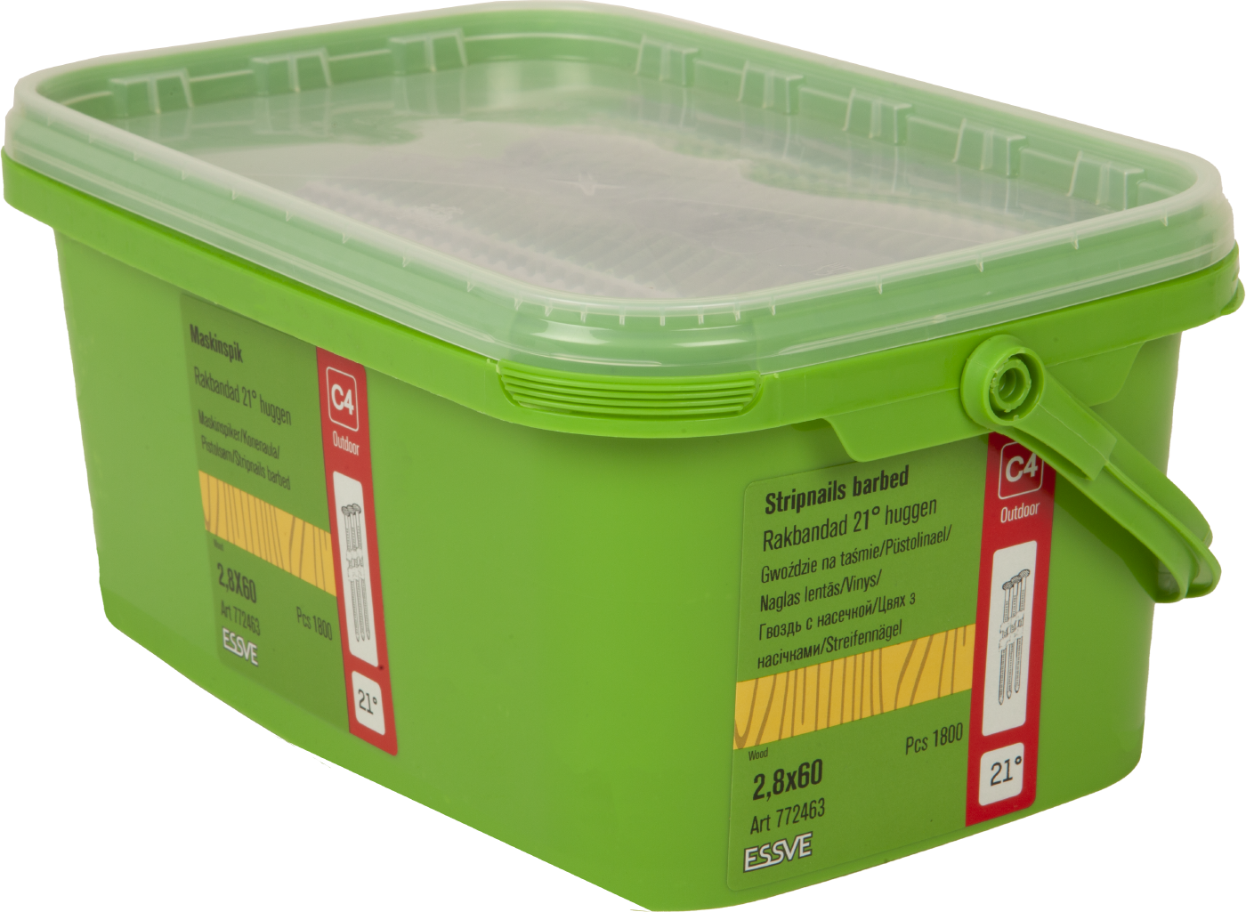 ESSVE Maskinspiker, Huggen, M-fusion. Kompatibel med de fleste standardverktøy. M-Fusion er en overflatebehandling med bedre rustmotstand (C4), mot klassisk varmforsinket (C3). Ved bruk av varmforsinket spiker C3, eller M-Fusion C4, skal kledning alltid beises/males umiddelbart etter montering. Dette gjelder uansett om panel/trevirke er forbehandlet fra fabrikk. Kledning som skal forbli ubehandlet, behandles med jernvitrol eller monteres i kystnære miljøer skal benytte syrefast A4 spiker.