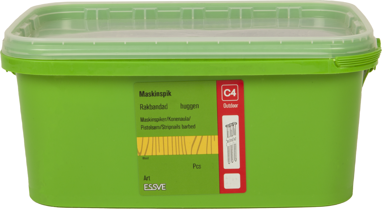 ESSVE Maskinspiker, Huggen, M-fusion. Kompatibel med de fleste standardverktøy. M-Fusion er en overflatebehandling med bedre rustmotstand (C4), mot klassisk varmforsinket (C3). Ved bruk av varmforsinket spiker C3, eller M-Fusion C4, skal kledning alltid beises/males umiddelbart etter montering. Dette gjelder uansett om panel/trevirke er forbehandlet fra fabrikk. Kledning som skal forbli ubehandlet, behandles med jernvitrol eller monteres i kystnære miljøer skal benytte syrefast A4 spiker.
